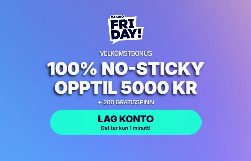 Når du registrerer deg hos CasinoFriday, kan du sikre deg en 100 % non-sticky bonus opptil 5 000 kr og 200 gratisspinn. Fordi det er en non-sticky bonus, holdes ekte penger og bonusmidler atskilt, noe som gir deg mer fleksibilitet når du spiller med en Casino Friday bonus.